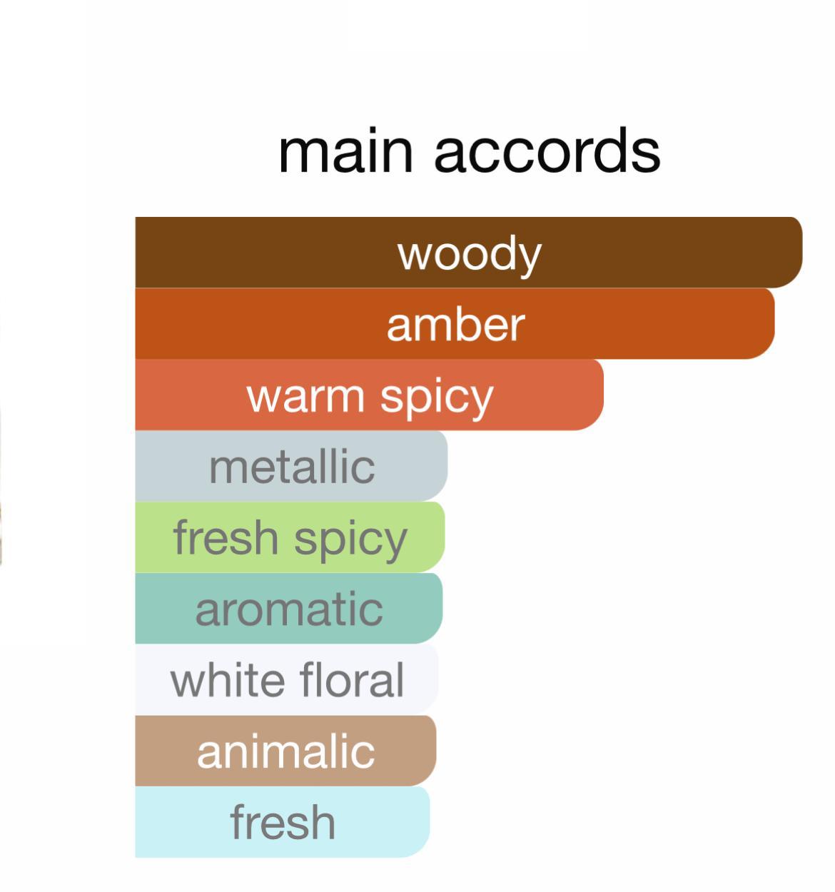 • 🔥 Main Accords: Woody, Amber, Warm Spicy, Metallic, Fresh Spicy, Aromatic, White Floral, Animalic, Fresh